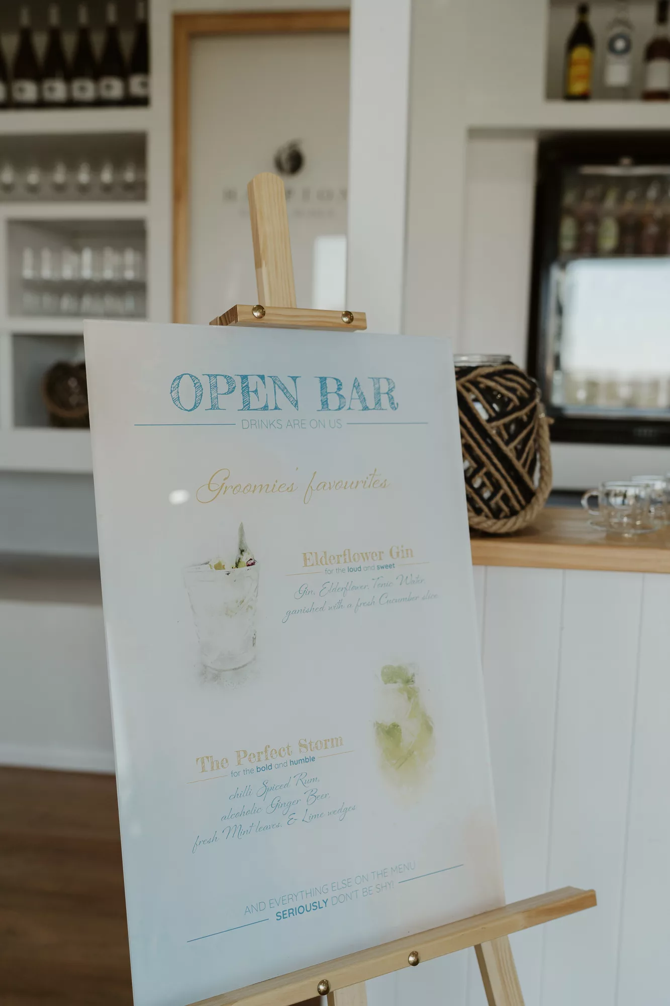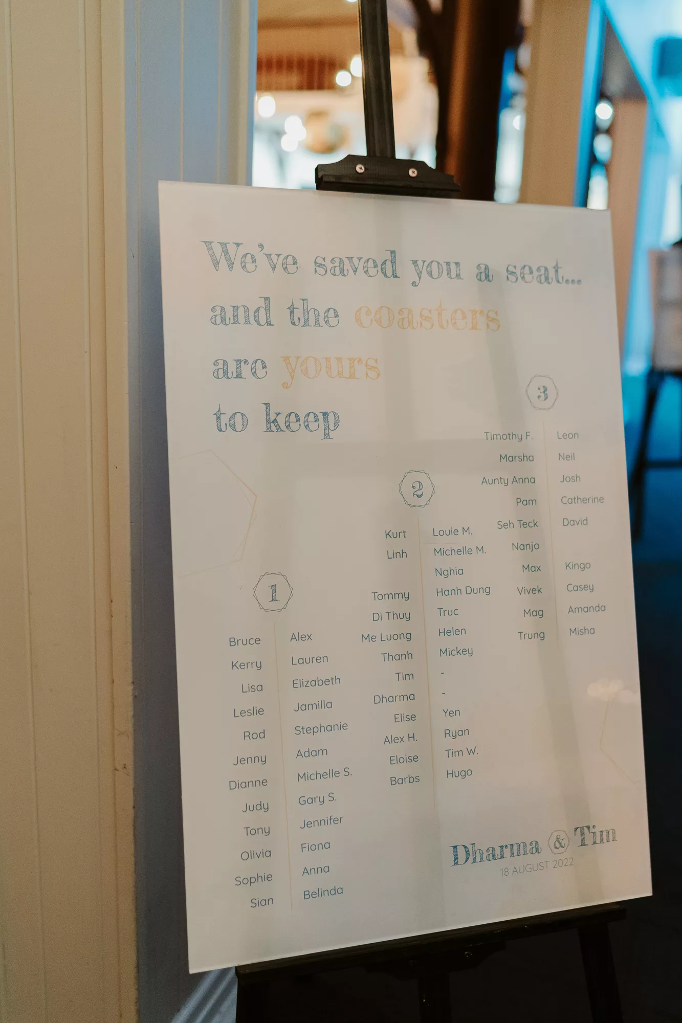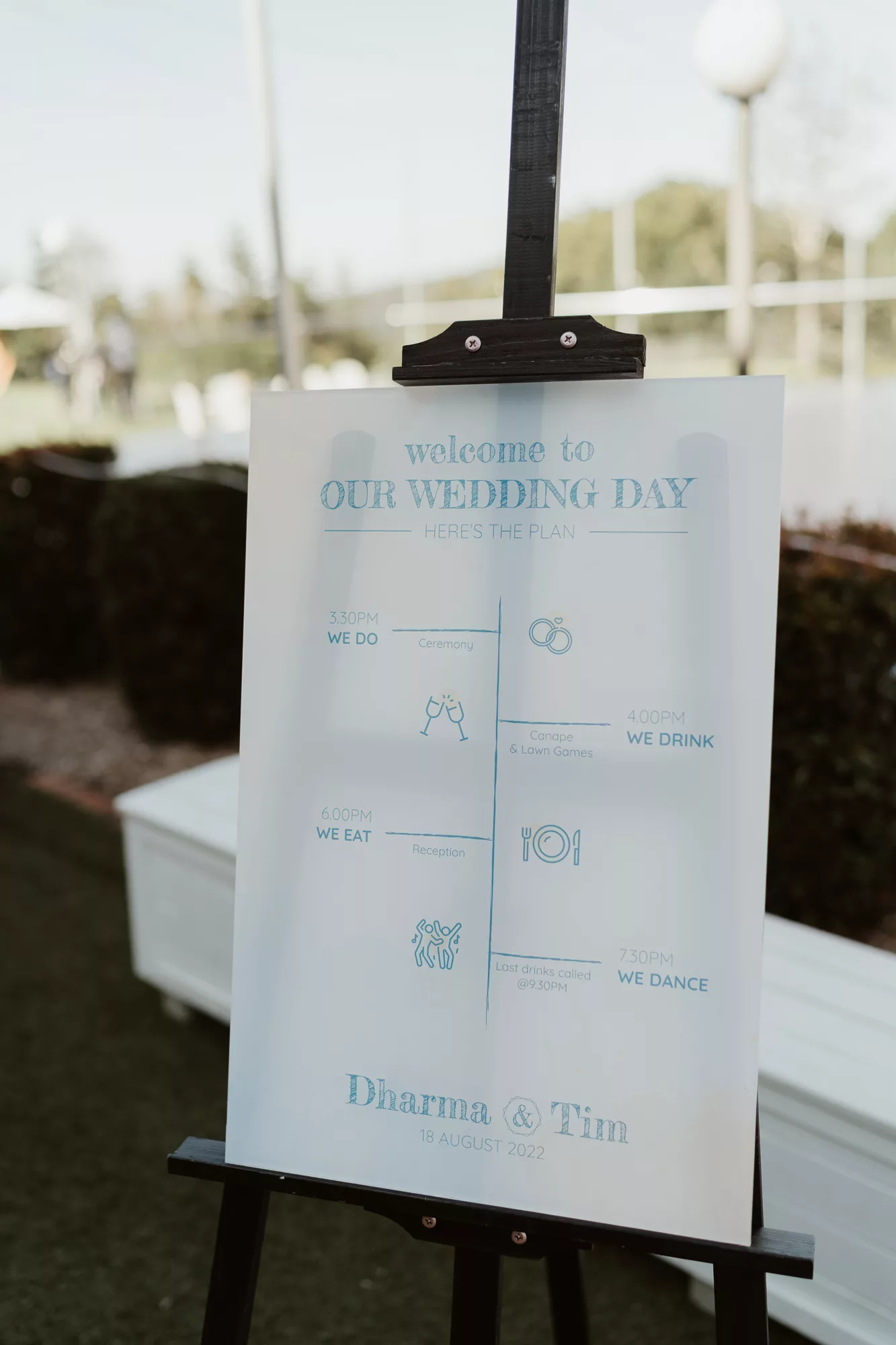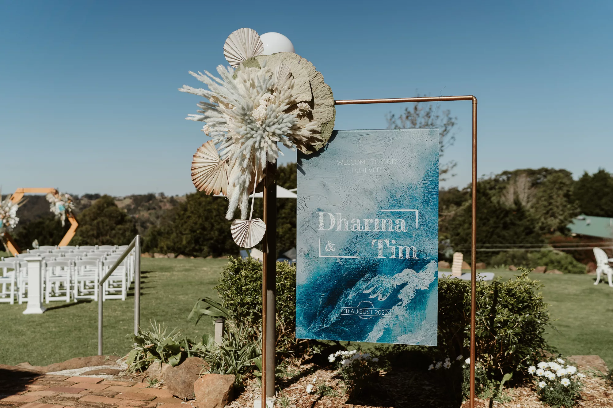 The wedding was designed with a natural, dried grass aesthetic and minimal floral arrangements, accented by touches of blue and teal. The hexagon was prominently featured as the key shape throughout all signage and materials.