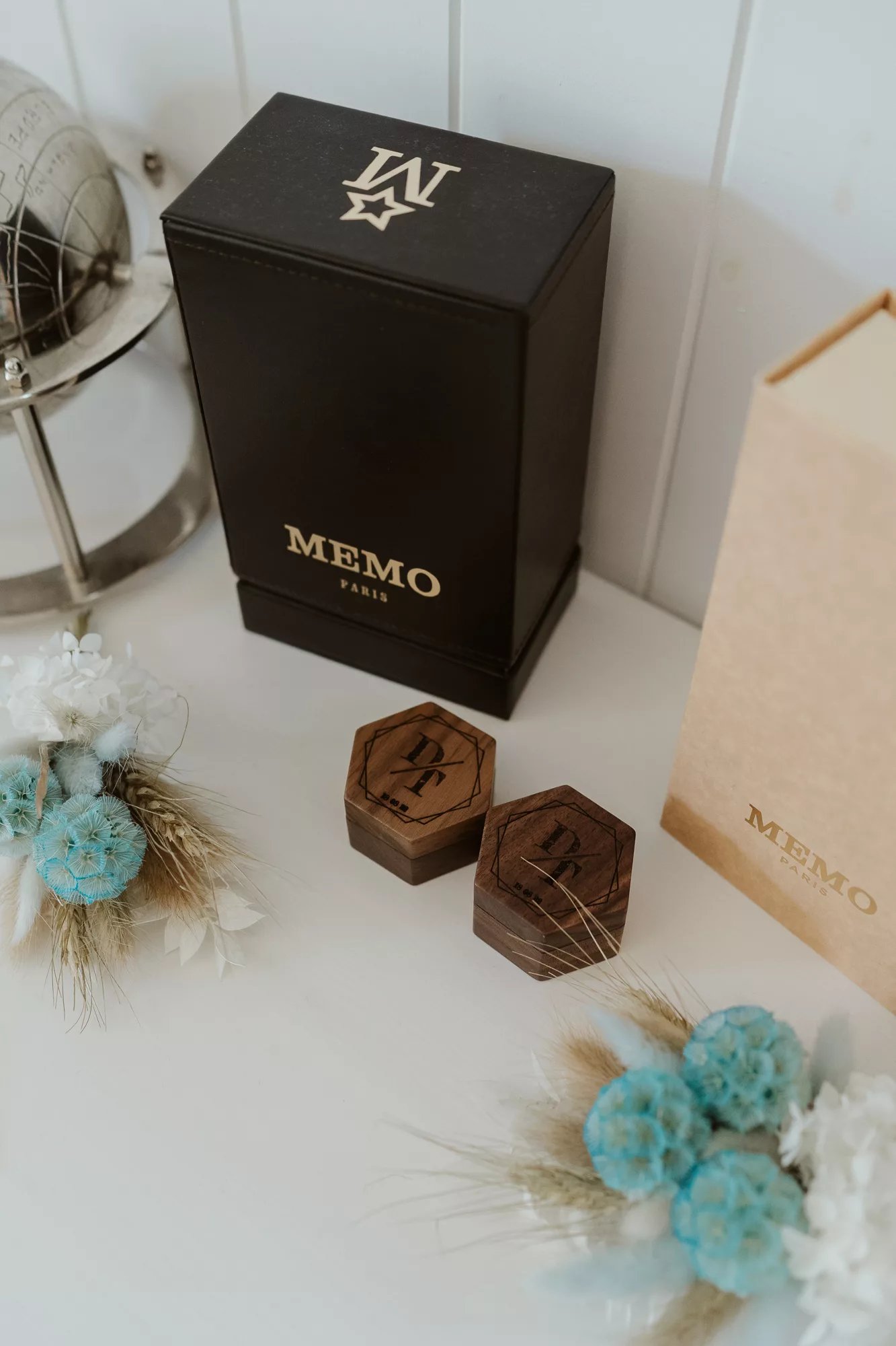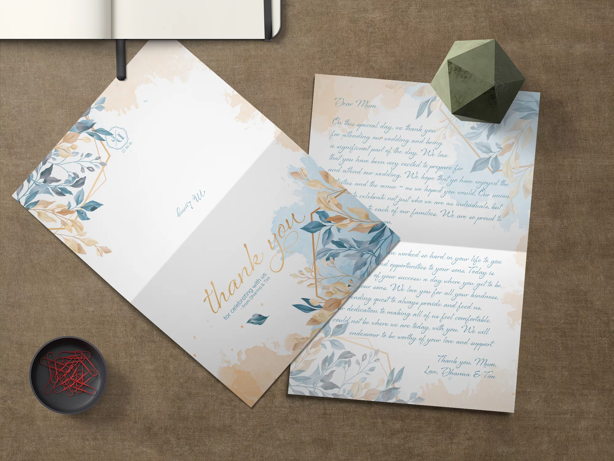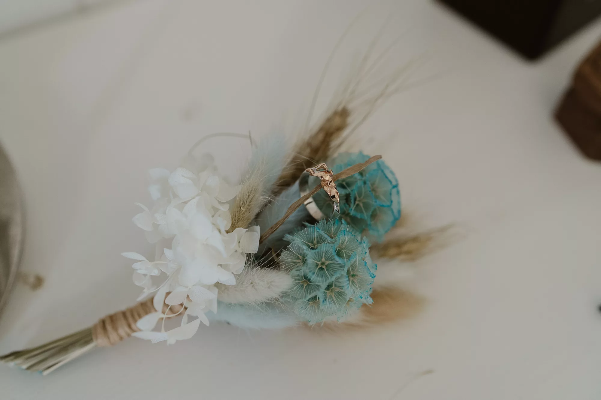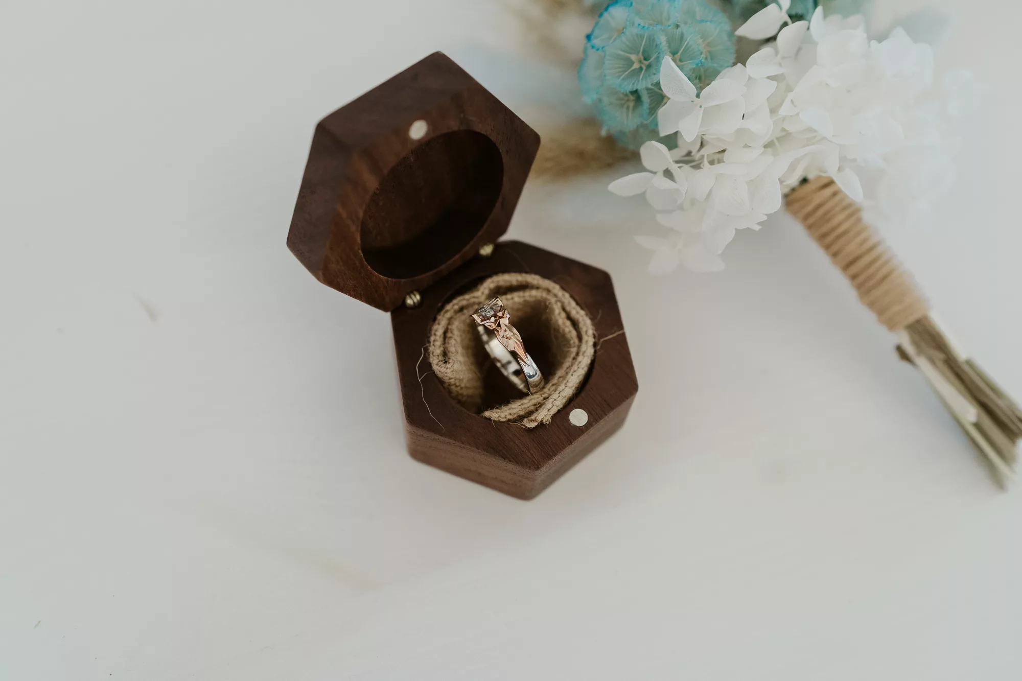 The wedding was designed with a natural, dried grass aesthetic and minimal floral arrangements, accented by touches of blue and teal. The hexagon was prominently featured as the key shape throughout all signage and materials.